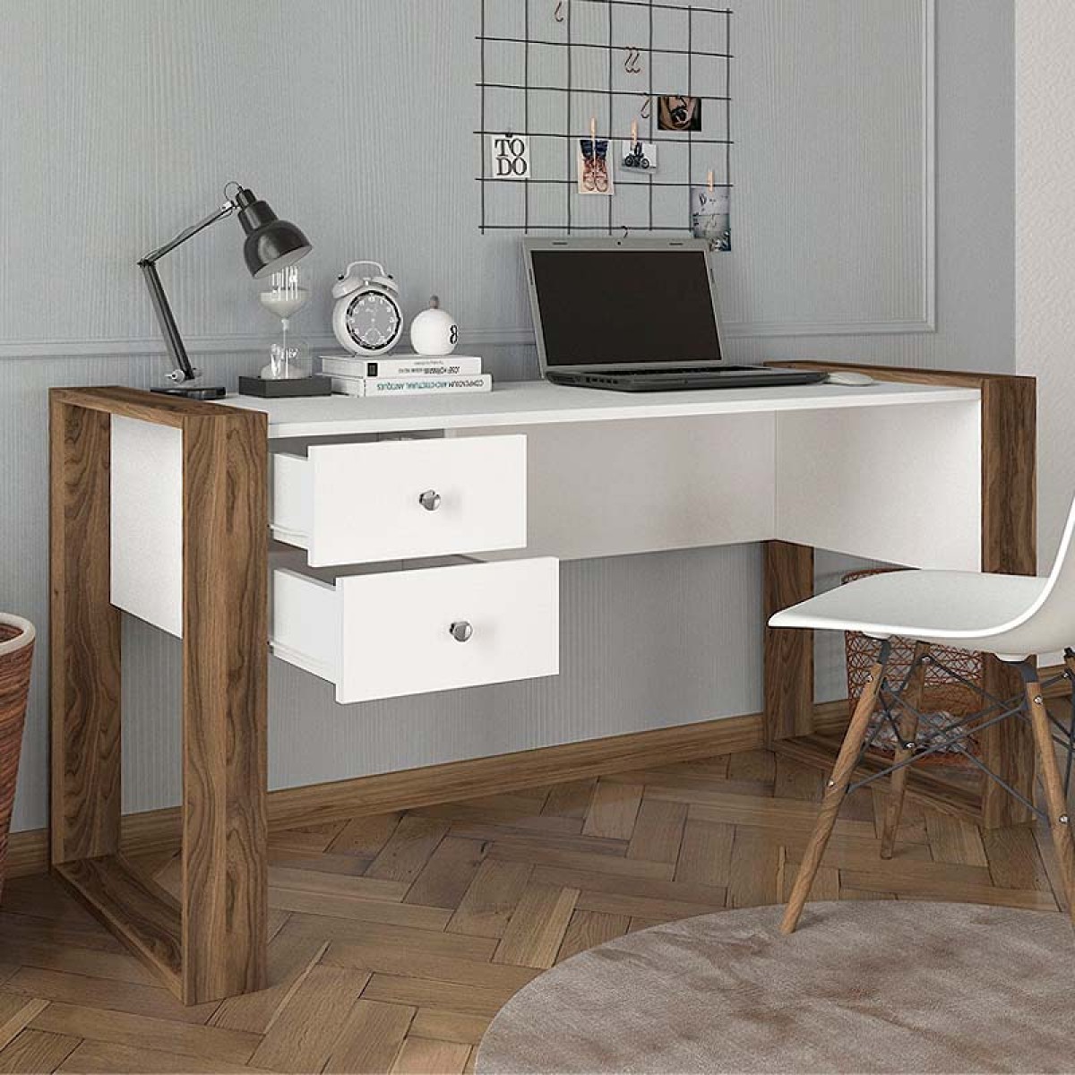 Γραφείο εργασίας Fernando Megapap από μελαμίνη χρώμα λευκό - καρυδί 158,4x60x72,2εκ.