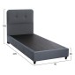 Το κεφαλάρι είναι ψηλό και έχει διακόσμηση με 2 μόνο τρουκς (κουμπάκια), ενώ και όλη η επένδυση του κρεβατιού είναι από υπέροχο βελούδινο ύφασμα. Το ΓΚΡΙ χρώμα σε όλο το κρεβάτι είναι ουδέτερο και μπορεί να συνδυαστεί με πληθώρα διακοσμητικών μοτίβων. Όμως, το κύριο χαρακτηριστικό αυτού του κρεβατιού είναι ότι δεν ακολουθεί την κλασική κατασκευή με τις τάβλες του σομιέ για την στήριξη του στρώματος, αλλά αντίθετα αποτελείται από μια συνεχόμενη επιφάνεια πάνω στην οποία τοποθετείται το στρώμα! Σε διαστάσεις μονού στρώματος 90x200 εκ.
