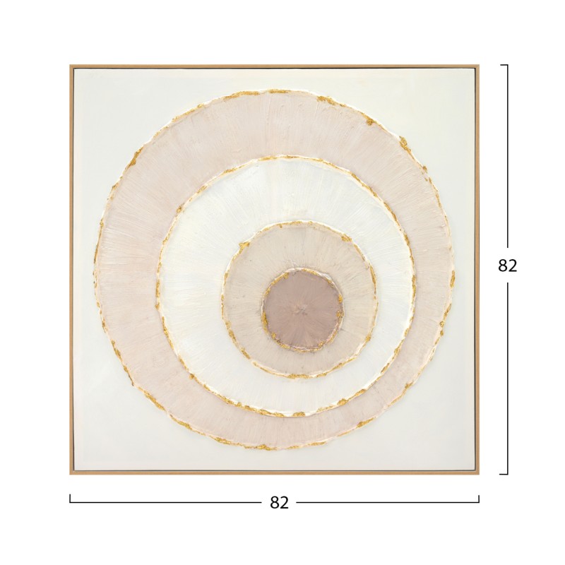 Ανάμεσα σε όλα τα διακοσμητικά στοιχεία, τα έργα τέχνης και ειδικά οι πίνακες ζωγραφικής παίζουν εξέχοντα ρόλο: όχι μόνο προσθέτουν χρώμα και αισθητική ομορφιά, αλλά δίνουν επίσης βάθος και νόημα στον χώρο μας. Ένας πίνακας μεταμορφώνει τον τρόπο που αντιλαμβανόμαστε έναν χώρο. Διακοσμήστε, λοιπόν, τον χώρο σας με έναν από τους καινούργιους πίνακες που προστέθηκαν στην γκάμα μας! Αυτός ο τετράγωνος πίνακας είναι ζωγραφισμένος 100% με το χέρι και απεικονίζει κύκλους σε μπεζ-λευκό με χρυσές λεπτομέρειες. Η κορνίζα είναι ΜΠΕΖ από πολυστυρένιο.