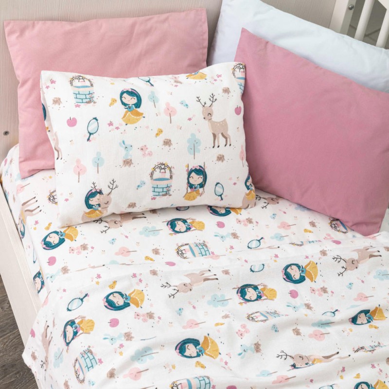 Σετ σεντόνια κούνιας με μαξιλαροθήκη από ύφασμα φανέλα, 100% βαμβακερό, εμπριμέ, χρώμα ροζέ σε λευκό φόντο, σχέδιο πριγκίπισσα.