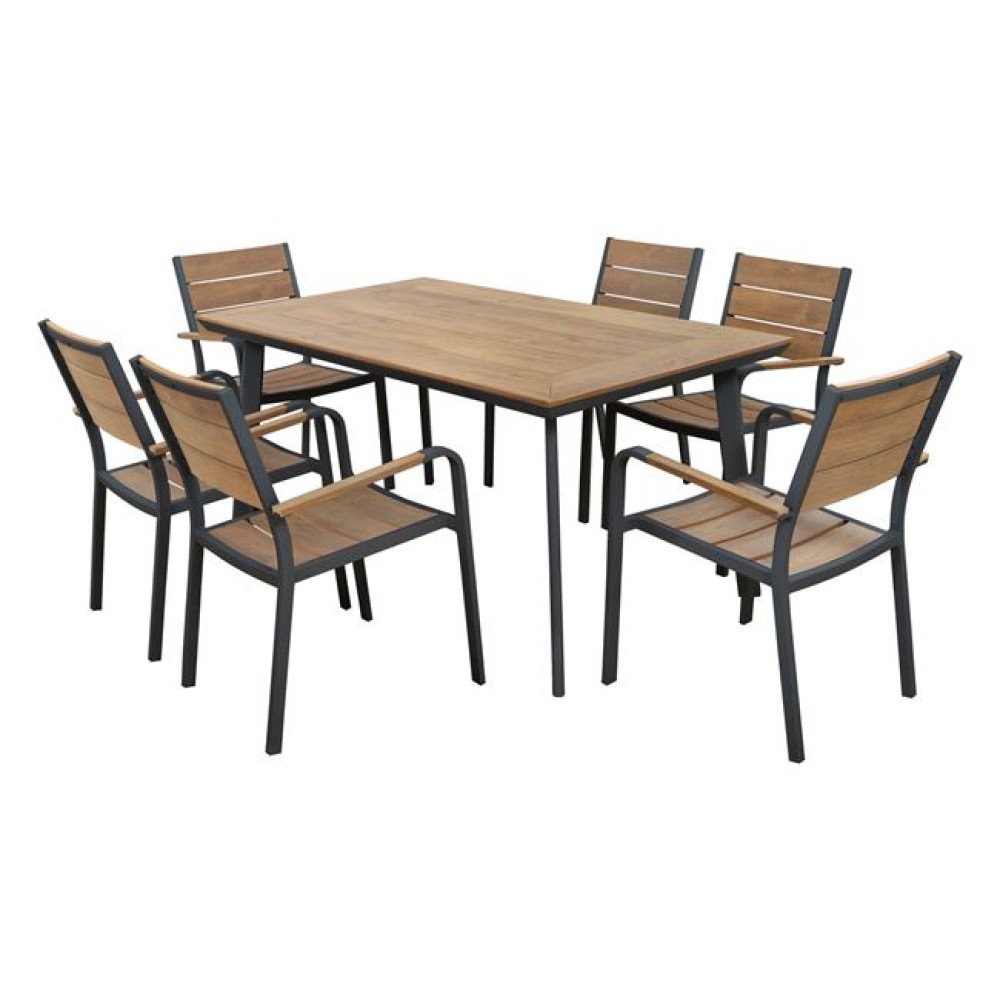 Αυτό το Σετ τραπεζαρίας εξωτερικού χώρου διαθέτει μεγάλο τραπέζι με σκελετό αλουμινίου σε ΑΝΘΡΑΚΙ χρώμα και επιφάνεια από polywood (είδος πλαστικής ξυ..