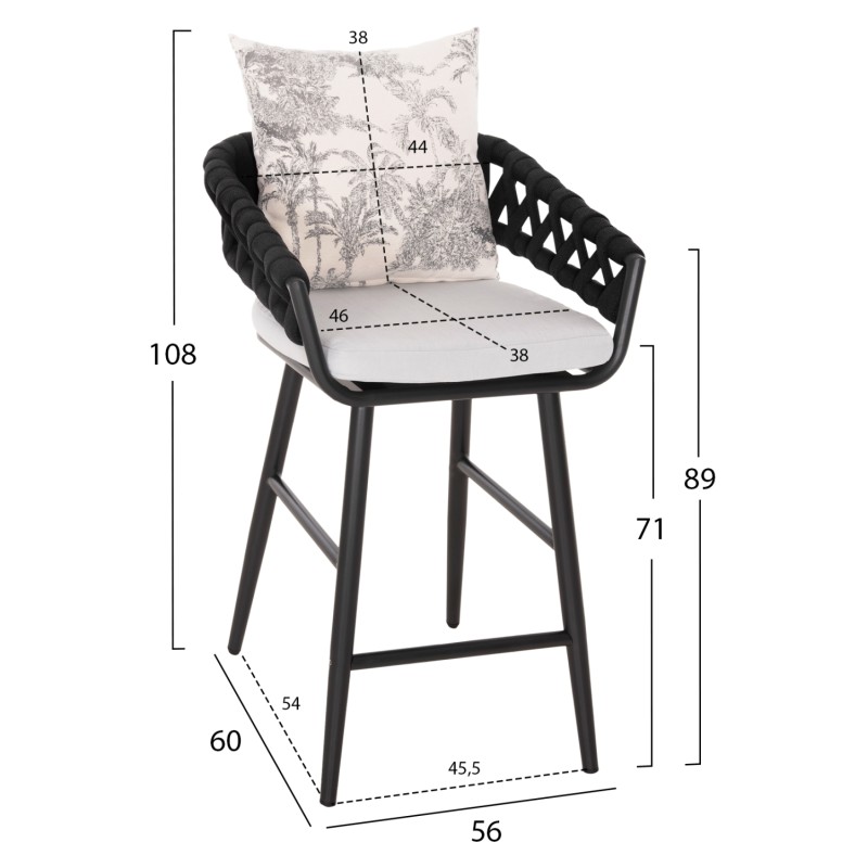 Το σκαμπό μπαρ αλουμινίου CAMDEN σε ΑΝΘΡΑΚΙ χρώμα δεν έχει ξεχωριστά μπράτσα αλλά η πλάτη είναι ημικυκλική αγκαλιάζοντας το σώμα. Πρόκειται για ένα ξεχωριστό σκαμπό με χαμηλή πλάτη από συνθετικό φαρδύ πολυεστερικό σχοινί (terylene). Το ιδιαίτερο χαρακτηριστικό αυτού του σκαμπό είναι ότι διαθέτει αναπαυτικά μαξιλάρια (με φερμουάρ) τόσο στο κάθισμα σε ΛΕΥΚΟ χρώμα, όσο και στην πλάτη σε ΕΚΡΟΥ χρώμα με PRINT σχέδιο. ΔΙΑΣΤΑΣΕΙΣ: 56x60x95-108Υ εκ. Διαστάσεις καθίσματος: 46x38 εκ. Διαστάσεις πλάτης: 4...