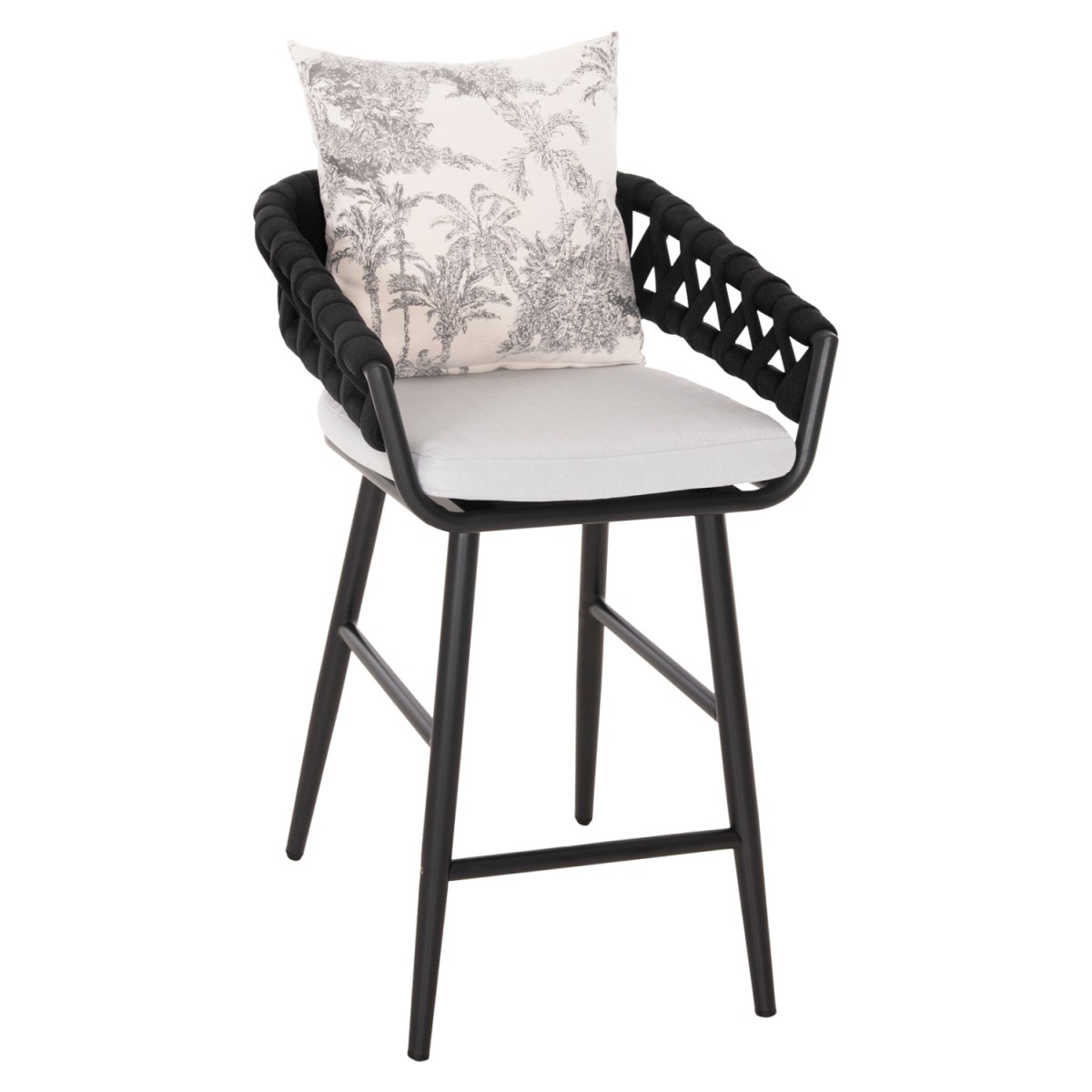 Το σκαμπό μπαρ αλουμινίου CAMDEN σε ΑΝΘΡΑΚΙ χρώμα δεν έχει ξεχωριστά μπράτσα αλλά η πλάτη είναι ημικυκλική αγκαλιάζοντας το σώμα. Πρόκειται για ένα ξεχωριστό σκαμπό με χαμηλή πλάτη από συνθετικό φαρδύ πολυεστερικό σχοινί (terylene). Το ιδιαίτερο χαρακτηριστικό αυτού του σκαμπό είναι ότι διαθέτει αναπαυτικά μαξιλάρια (με φερμουάρ) τόσο στο κάθισμα σε ΛΕΥΚΟ χρώμα, όσο και στην πλάτη σε ΕΚΡΟΥ χρώμα με PRINT σχέδιο.