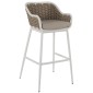 Το σκαμπό HM5862.02, κυρίως για επαγγελματική χρήση, είναι αυτό που ψάχνετε για ένα τέτοιο έπιπλο! Μοντέρνο, άνετο και σταθερό! Η διχρωμία του ΛΕΥΚΟΥ σκελετού με την ΜΠΕΖ επένδυση από σχοινί σε όλη την πλάτη είναι μοναδική. Η πλάτη με τα μπράτσα αποτελούν ένα ενιαίο κομμάτι με κάθετες βέργες που είναι πλεγμένες με σχοινί και αγκαλιάζουν το σώμα, ενώ η πλάτη είναι ψηλότερη από τα μπράτσα. Ο σκελετός είναι ψηλός και τα πόδια ενώνονται μεταξύ τους με μια δοκό που λειτουργεί ως υποπόδιο. Το μαξιλάρι του καθίσματος είναι και αυτό σε μπεζ χρώμα και είναι άνετο. Το σκαμπό αυτό θα αναβαθμίσει αισθητικά τον χώρο που θα το τοποθετήσετε και θα τραβήξει τα βλέμματα χάρη στα υλικά κατασκευής του.