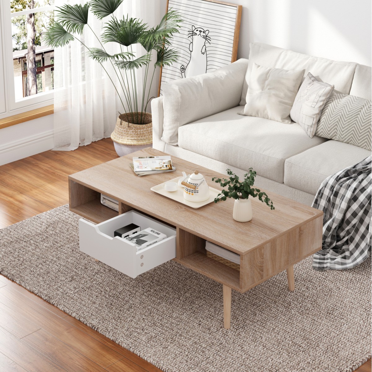 Το τραπεζάκι σαλονιού μελαμίνης KRENER είναι μια ποιοτική και όμορφη πρόταση για κάθε σαλόνι. Είναι κατασκευασμένο από μελαμίνη σε χρώμα SONAMA και διαθέτει ψηλά πόδια από μασίφ ξύλο πεύκου. Είναι λιτό και πέρα από την κύρια επιφάνειά του, διαθέτει 3 χώρους ακριβώς από κάτω. Ένα συρτάρι με χωνευτό χερούλι σε ΛΕΥΚΟ χρώμα στην μέση και 2 ανοιχτούς χώρους τοποθέτησης αντικειμένων δεξιά και αριστερά του συρταριού.